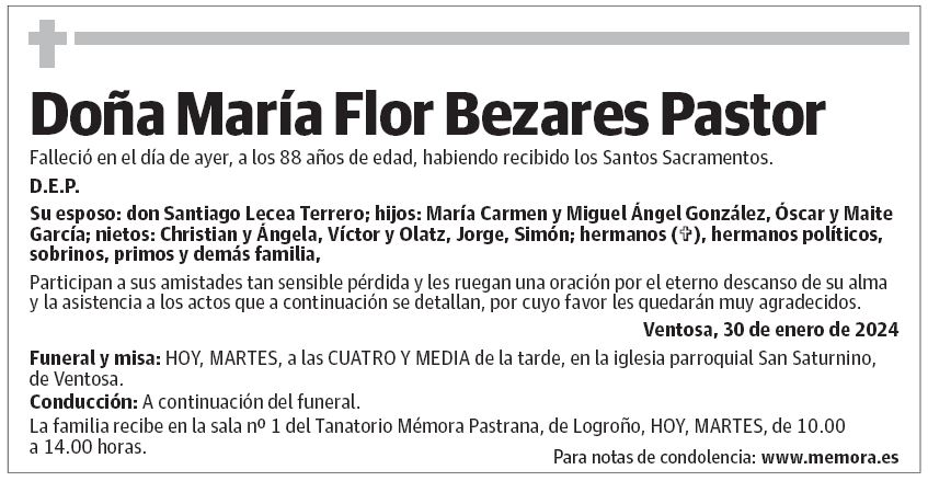 La familia recibe en la sala nº 1 del Tanatorio Mémora Pastrana, de Logroño, HOY, MARTES, de 10.00 a 14.00 horas.