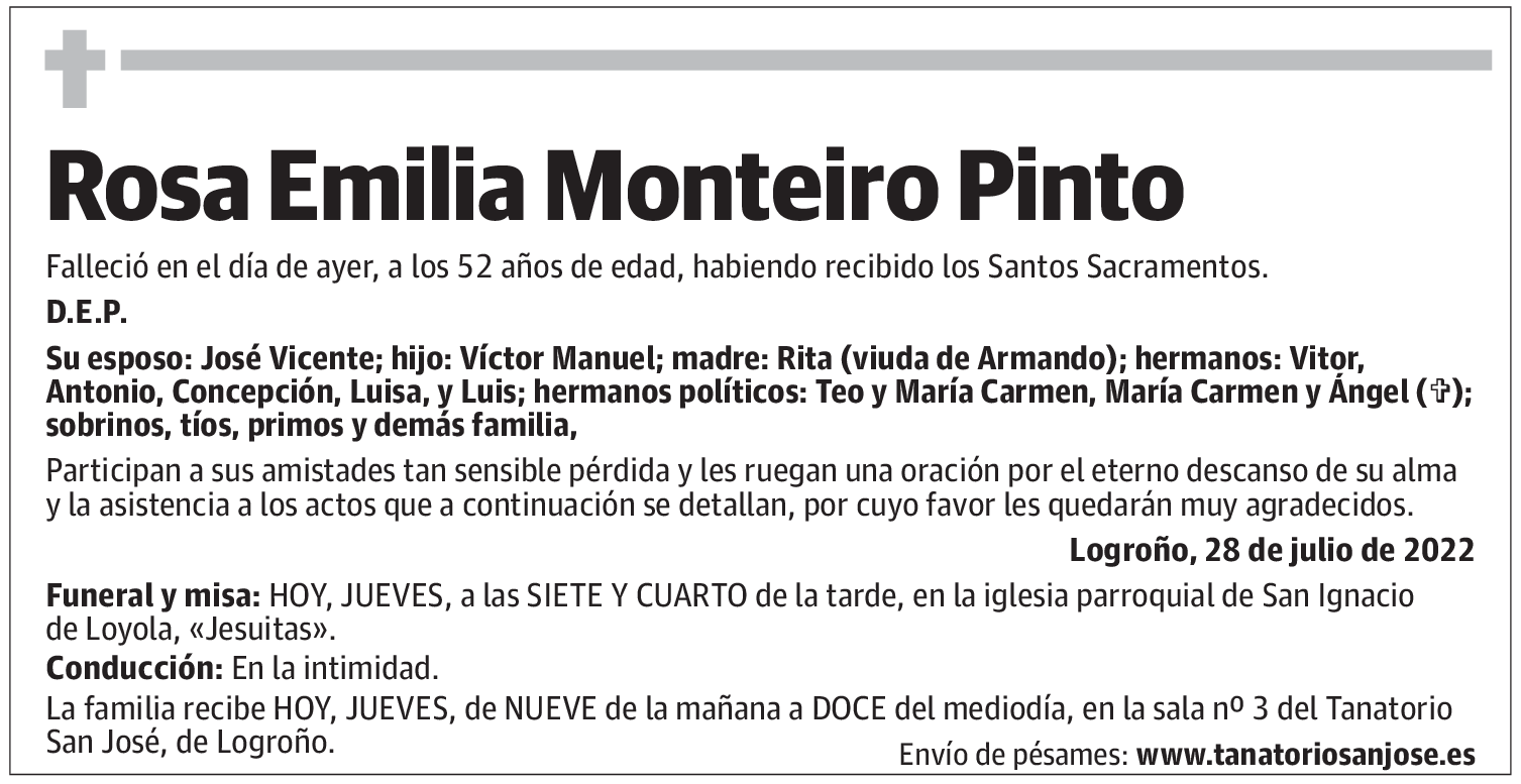 Su esposo: José Vicente; hijo: Víctor Manuel; madre: Rita (viuda de Armando); hermanos: Vitor, Antonio, Concepción, Luisa, y Luis; hermanos políticos: Teo y María Carmen, María Carmen y Ángel (✞); sobrinos, tíos, primos y demás familia,